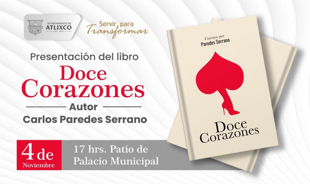 El próximo 4 de noviembre presentaré mi libro de cuentos Doce Corazones en la presidencia municipal de Atlixco a las 5 de la tarde.